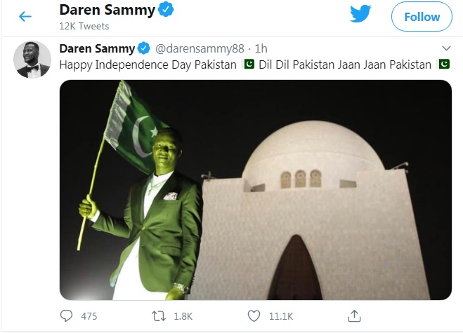Former West Indian captain Darren Sammy has extended his wishes people of Pakistan on 73rd independence day of Pakistan.